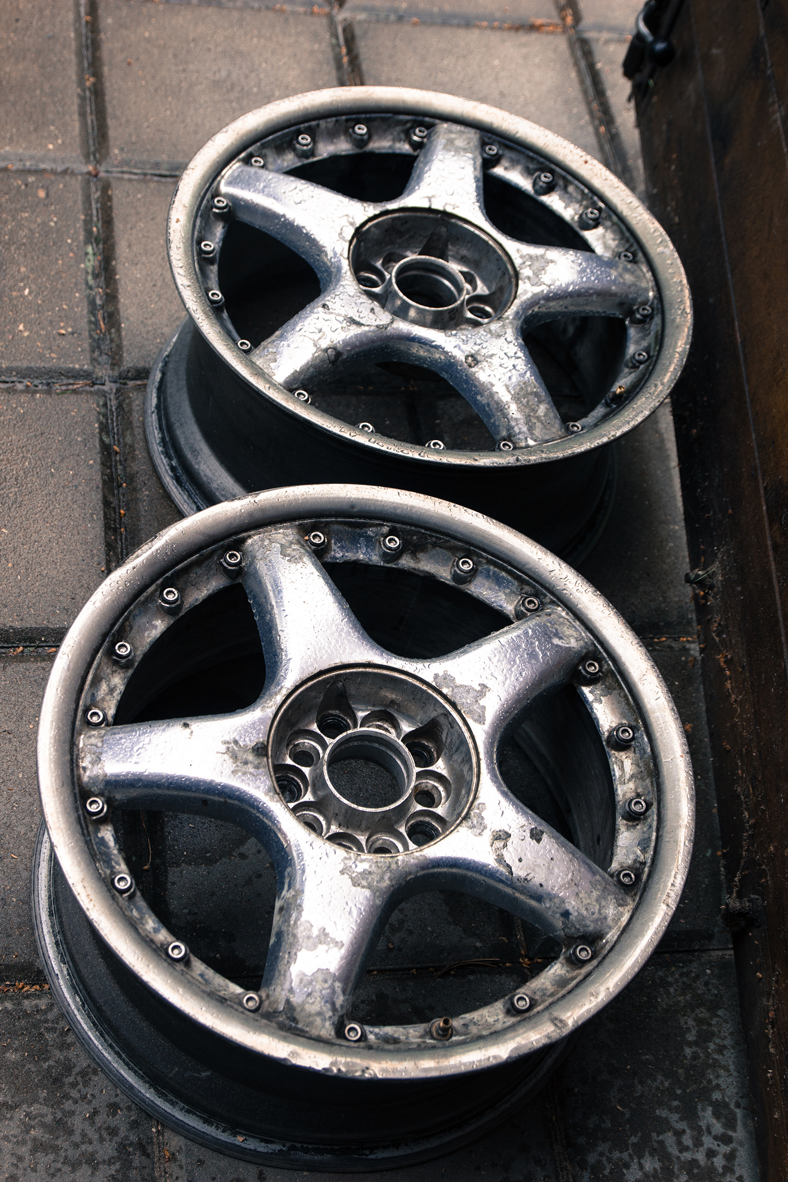 Pavasario metu išlindo tokie įdomesni ratukai, planavau antrą komplektą, kad trason nelėkti su tais plačiais RH. Apžiūrėjau, pasirodė - ok, nupirkau. Vėliau parsivežus ir pradėjus analizuoti įdėmiau pamačiau, kad čia esami specialūs ventyliai yra sugadinti, ratai žinoma paveikti korozijos, bet tai matėsi iš karto. Nusipirkau galvutę spec. šių ratų varžteliams, lietlempę ir pirmyn ardyti :)